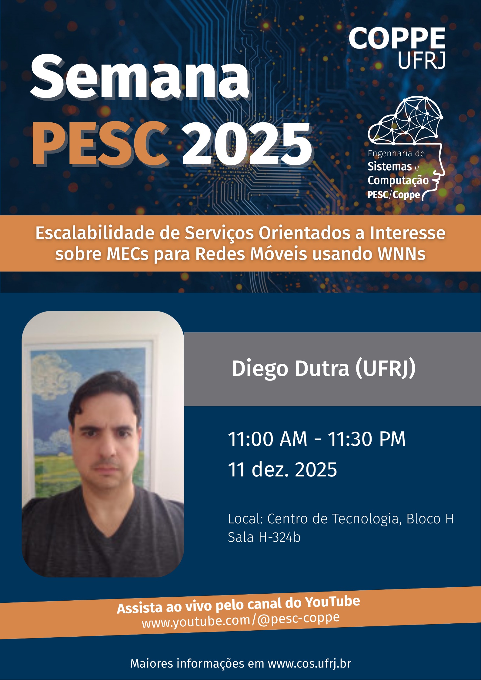 11:00 - (JCNE 2025) Diego Leonel Cadette Dutra (Programa de Engenharia de Sistemas e Computação) – Escalabilidade de Serviços Orientados a Interesse sobre MECs para Redes Móveis usando WNNs?