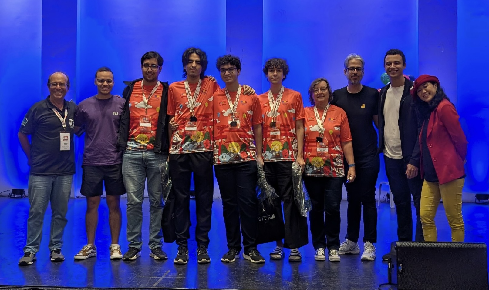 Na foto a Profa. Marcia Cerioli e, de uniforme e mais à esquerda, o Christopher Ciafrino (Ciência da Computação), que foi bolsista do projeto de Extensão que treinou de 2019 a 2023 alunos de Ensino Médio e calouros em Programação Competitiva. Cada estudante pode participar no máximo 5 vezes da Maratona de Programação.