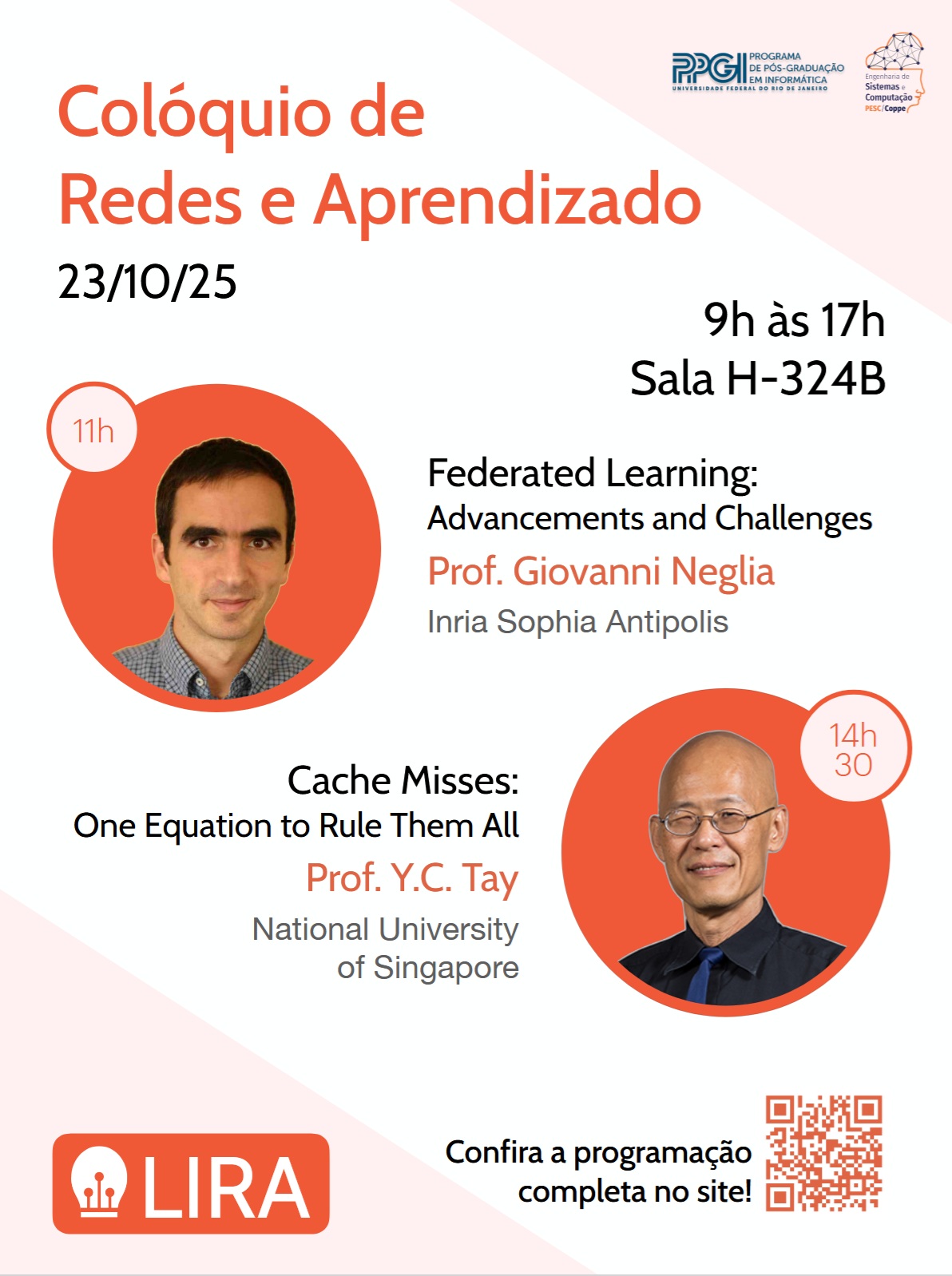 Estaremos recebendo os professores Giovanni Neglia (INRIA, França) e Y. C. Tay (National University of Singapore). Ambos são pesquisadores de grande destaque e excelentes palestrantes. Eles vão proferir as seguintes palestras (dia 23/10, quinta-feira):