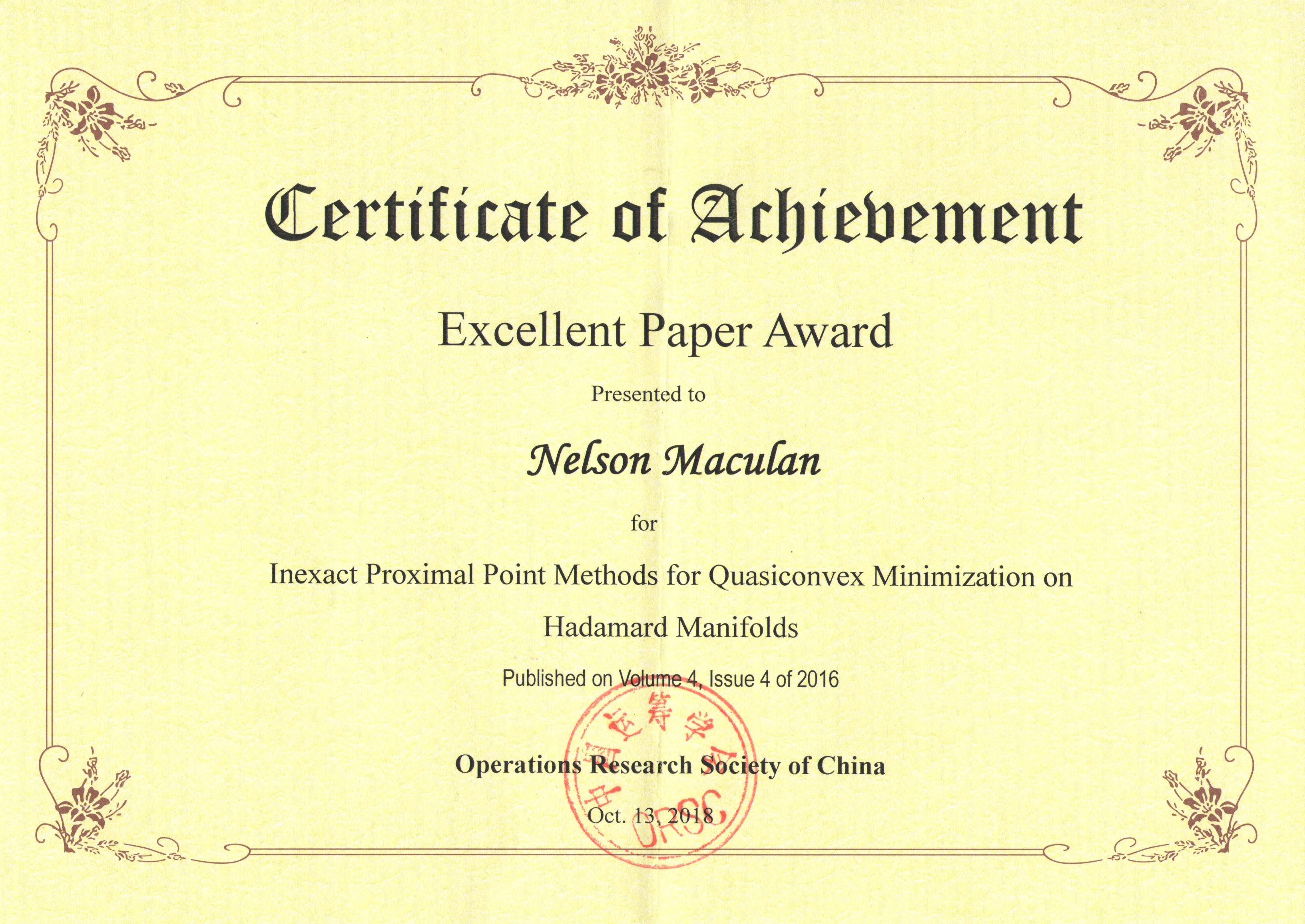 O artigo "Inexact Proximal Point Methods for Quasiconvex Minimization on Hadamard Manifolds", autores Nancy Baygorrea (D.Sc., PESC-COPPE-UFRJ, 2017), Erick Alex Papa Quiroz (D.Sc. PESC-COPPE-UFRJ, 2007) & Nelson Maculan, J. Oper. Res. Soc. China, vol. 4(4), 397-424, 2016 recebeu o prêmio de melhor artigo publicado em Journal of the Operations Research Society of China.