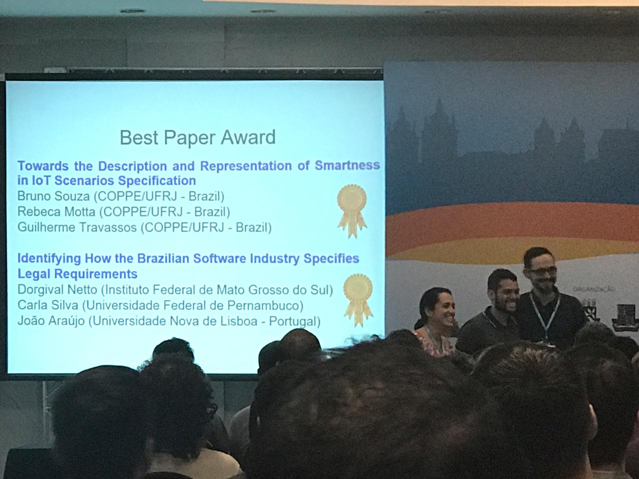 O trabalho "Towards the Description and Representation of Smartnees in IoT Scenarios Specification" dos alunos Bruno Pedraça de Souza (MSc) e Rebeca Campos Motta (DSc, aluna co-tutela UPHF/França), do Grupo de Engenharia de Software Experimental recebeu o Prémio de Melhor Artigo Científico na trilha de Insightful Ideas & Emerging Results do XXXIII Simpósio Brasileiro de Engenharia de Software, CBSOFT 2019. Bruno e Rebeca são orientados pelo Prof. Guilherme H. Travassos.