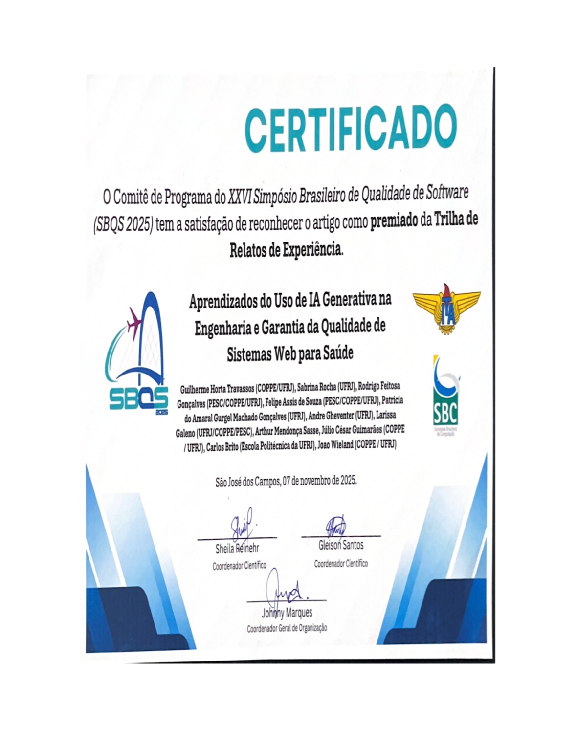 O artigo “Aprendizados do Uso de IA Generativa na Engenharia e Garantia da Qualidade em Sistemas Web para Saúde”, que relata a experiência de uso de IA na construção de um sistema de software para o Instituto de Doenças do Tórax (IDT) da UFRJ, foi premiado na Trilha de Relatos de Experiência do SBQS 2025.