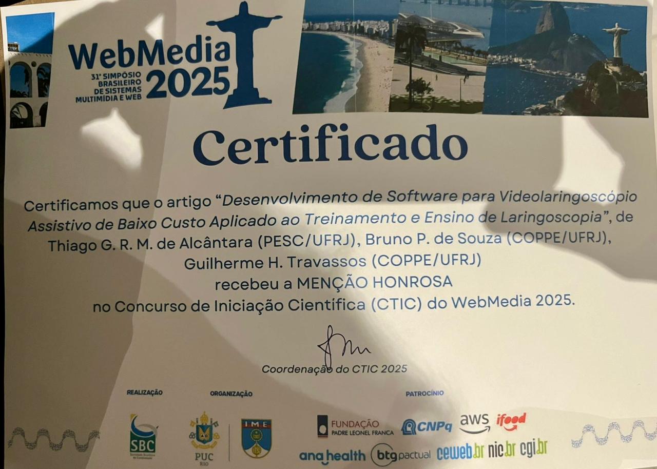 O artigo “Desenvolvimento de Software para Videolaringoscópio Assistivo de Baixo Custo Aplicado ao Treinamento e Ensino de Laringoscopia”, resultante do trabalho de conclusão de curso do Thiago Guimarães de Alcântara, recebeu Menção Honrosa no concurso de Iniciação Científica (CTIC) do WbMedia 2025.